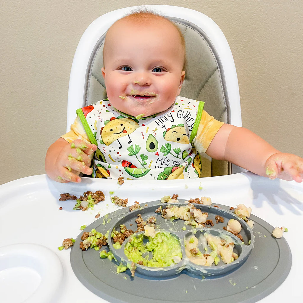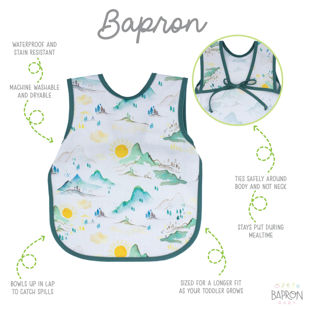 The bib-apron hybrid, full-coverage bib, smock, or apron, is designed for comfort and safety. Because of their comfortable, secure-fitting horizontal ties and their full-coverage design, Baprons are the perfect companion for mealtime, art, and sensory play!