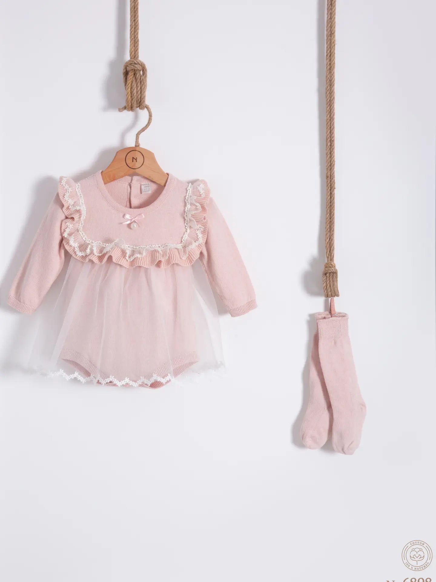 This elegant 2-piece baby girl set features a beautifully knitted dress with delicate lace accents and matching knitted socks. Crafted from 100% soft, breathable cotton, it provides exceptional comfort for delicate skin—perfect for warm days, special occasions, or as a thoughtful baby shower gift.