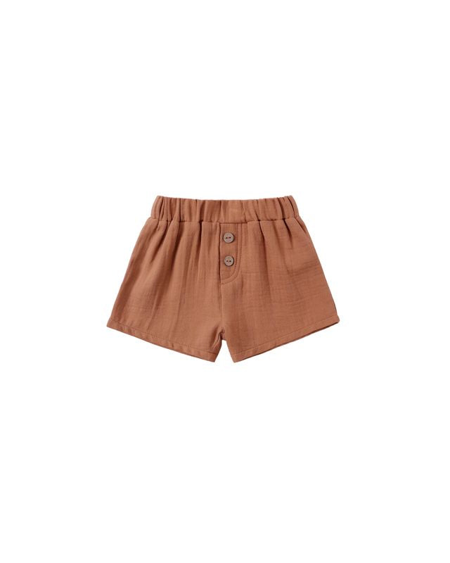 Woven short featuring an elastic waist and a mock fly with two buttons.
