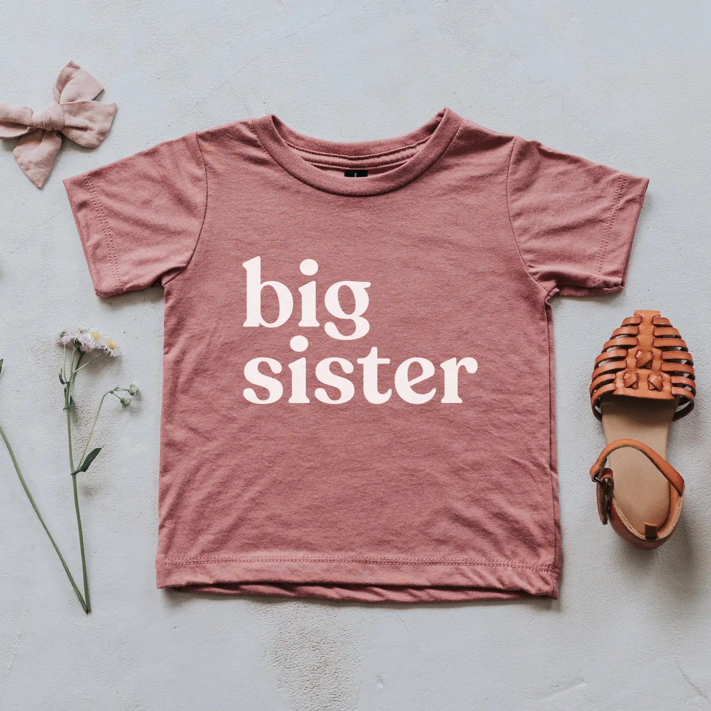 "Big Sister". Share sibling pride in style! This sweet kids shirt features trendy typography in white ink on super soft tri-blend mauve fabric. Designed with love and printed by hand in our Ohio workshop.