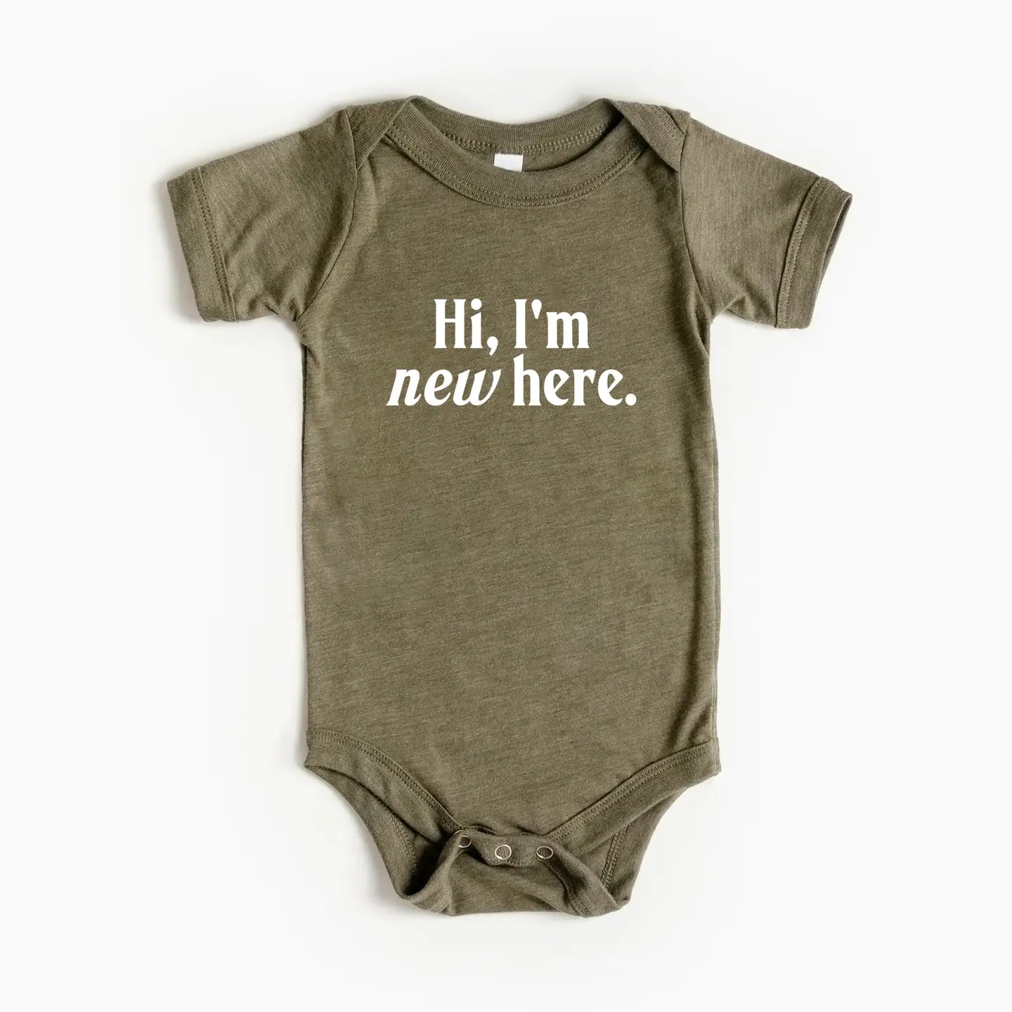 "Hi, I'm New Here" • Let's welcome the newcomer! This super-soft infant outfit features vintage typography in crisp white ink on a luxe olive green colored bodysuit - designed with love and screen printed in-house. Perfect for a baby's first introduction to the world!