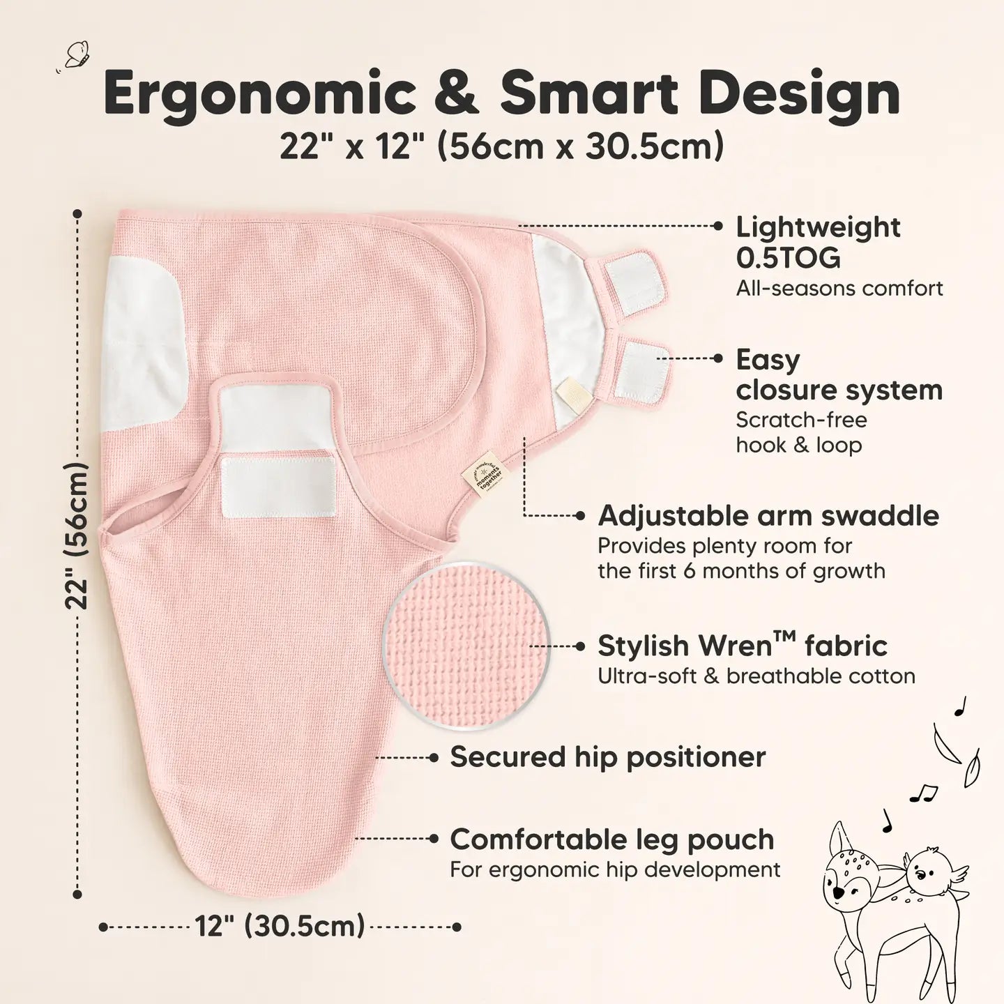 - IHDI-certified, ergonomic baby swaddle for infant's 0-6 months healthy hip development    - 100% organic cotton, 0.5TOG, soft waffle knit texture Wren fabric, more breathable than jersey cotton