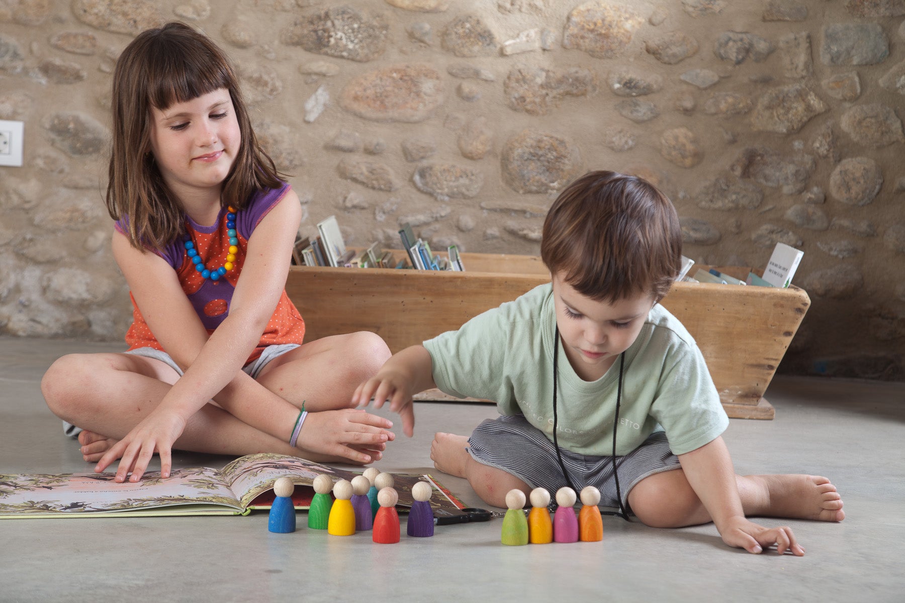 A group of 12 friendly Nins peg people in rainbow colors. The 12 Nins become a toy that can be used as a symbolic play to create stories and small worlds.