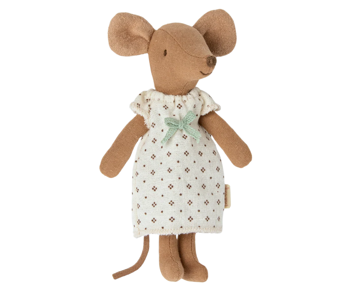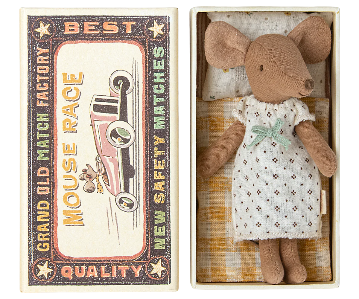 A classic Maileg item. This mouse is ready for hours of play and sleeps tight in the matchbox. The clothes and bed linen come in unique prints and beautiful colours.