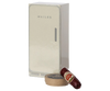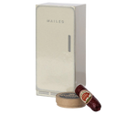 The perfect place to store your groceries so they stay fresh and cold. Inside the cooler, you find a small sausage and cheese. The cooler is made of cardboard and fits perfectly into the mouse castle.