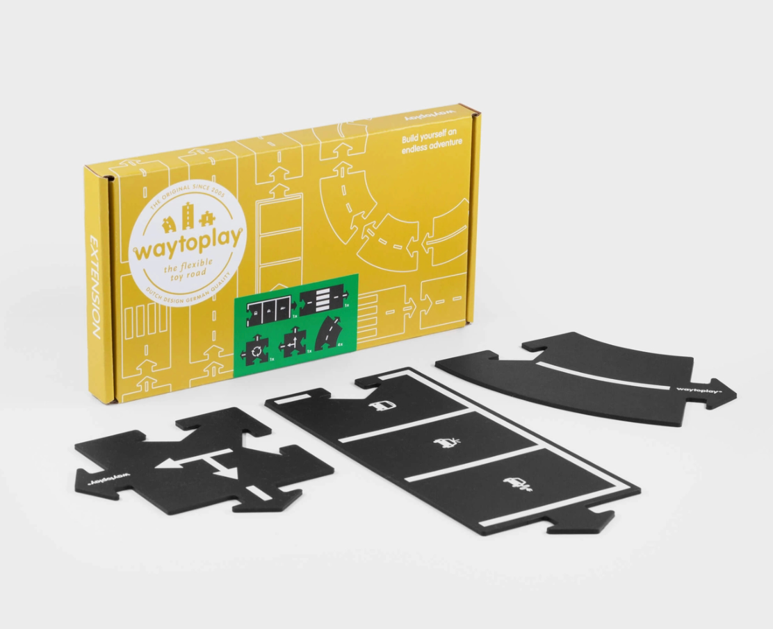 Waytoplay Mixed Extension Set with eight road parts. This new expansion set contains eight road parts : four curves, two straight parts (pedestrian crossing and parking) and two crossed road parts. The waytoplay flexible road parts are printed on both sides. Put them between or beside your waytoplay roads for even more fun. You expand your waytoplay lay-out with eight road parts.