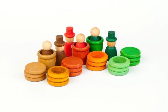 3 Nins, 3 Nins with top hat, 3 cups, 9 rings, 9 coins.