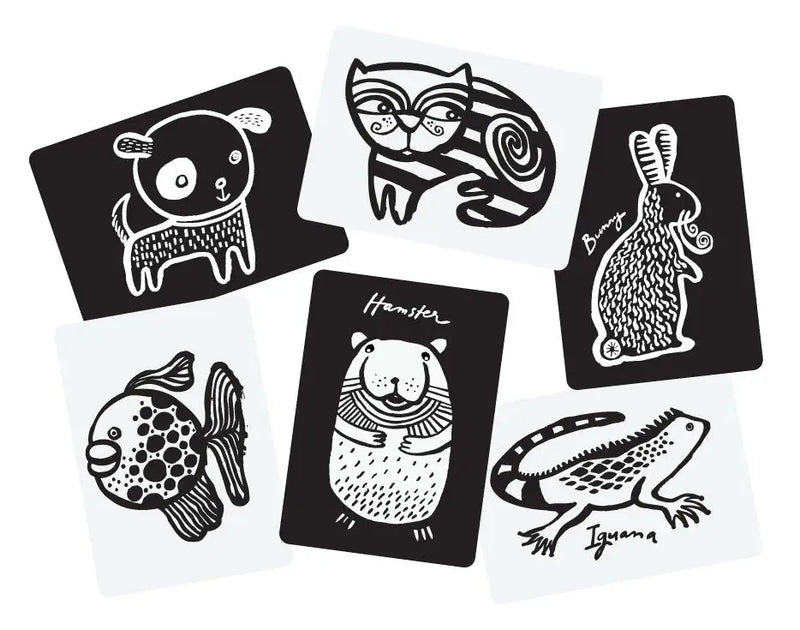 Pet art cards for baby. Babies are fascinated with black-and-white designs. The six adorable animals in this set include a dog, cat, rabbit, hamster, goldfish, and iguana. Each 5" x 7" card is beautifully finished with matte lamination and child-friendly rounded corners.