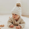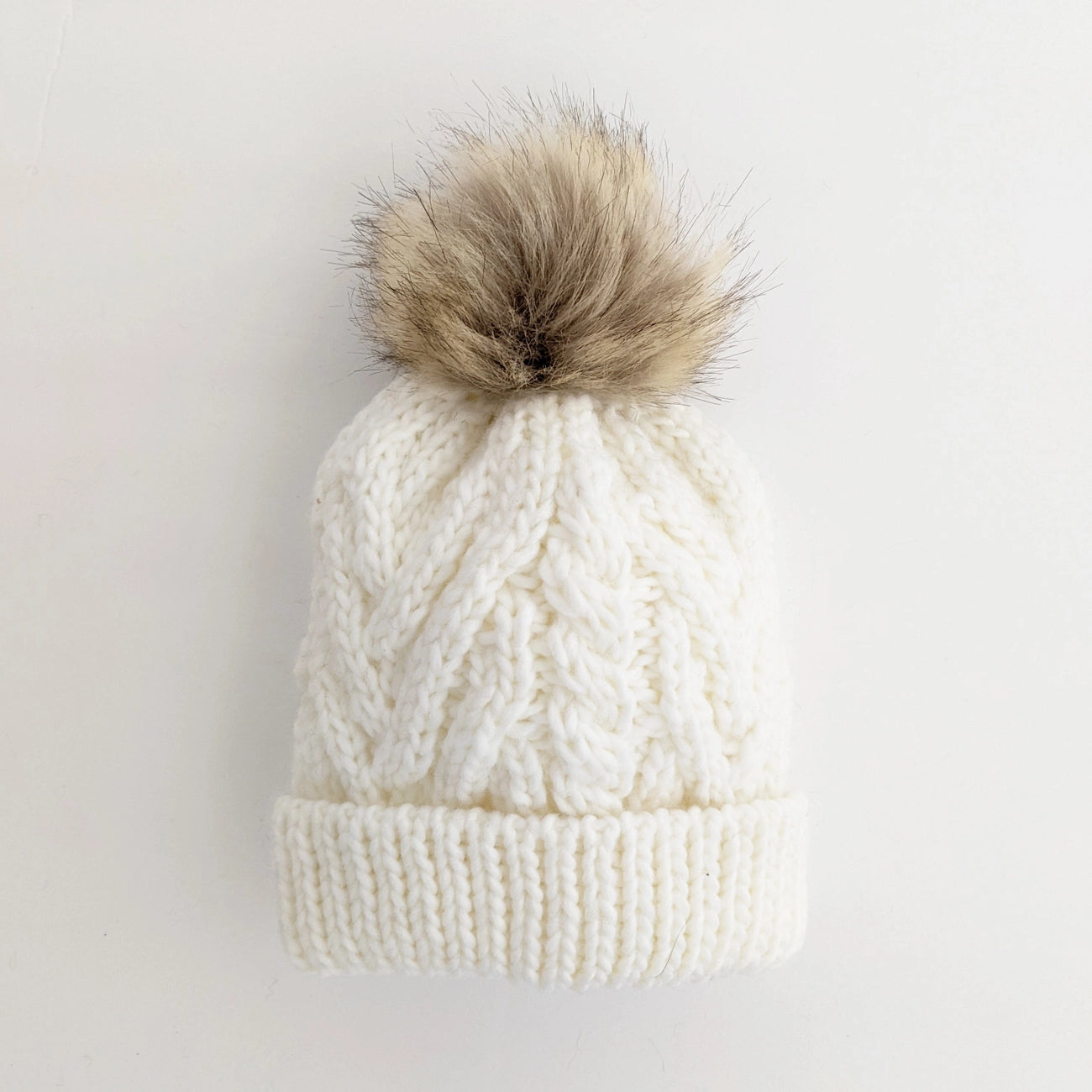 Super cozy hat hand-knit in Winter White hued Icelandic yarn is topped with a furry pom.  This is a great cold weather hat and is perfect for gift giving. It makes a fun photo prop too.   • 100% Acrylic • Cold handwash • Hand knit in China